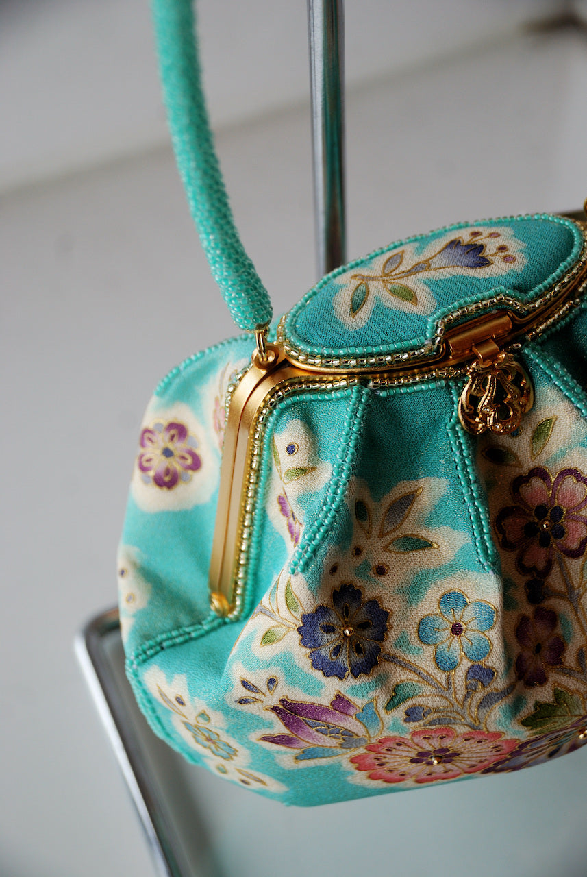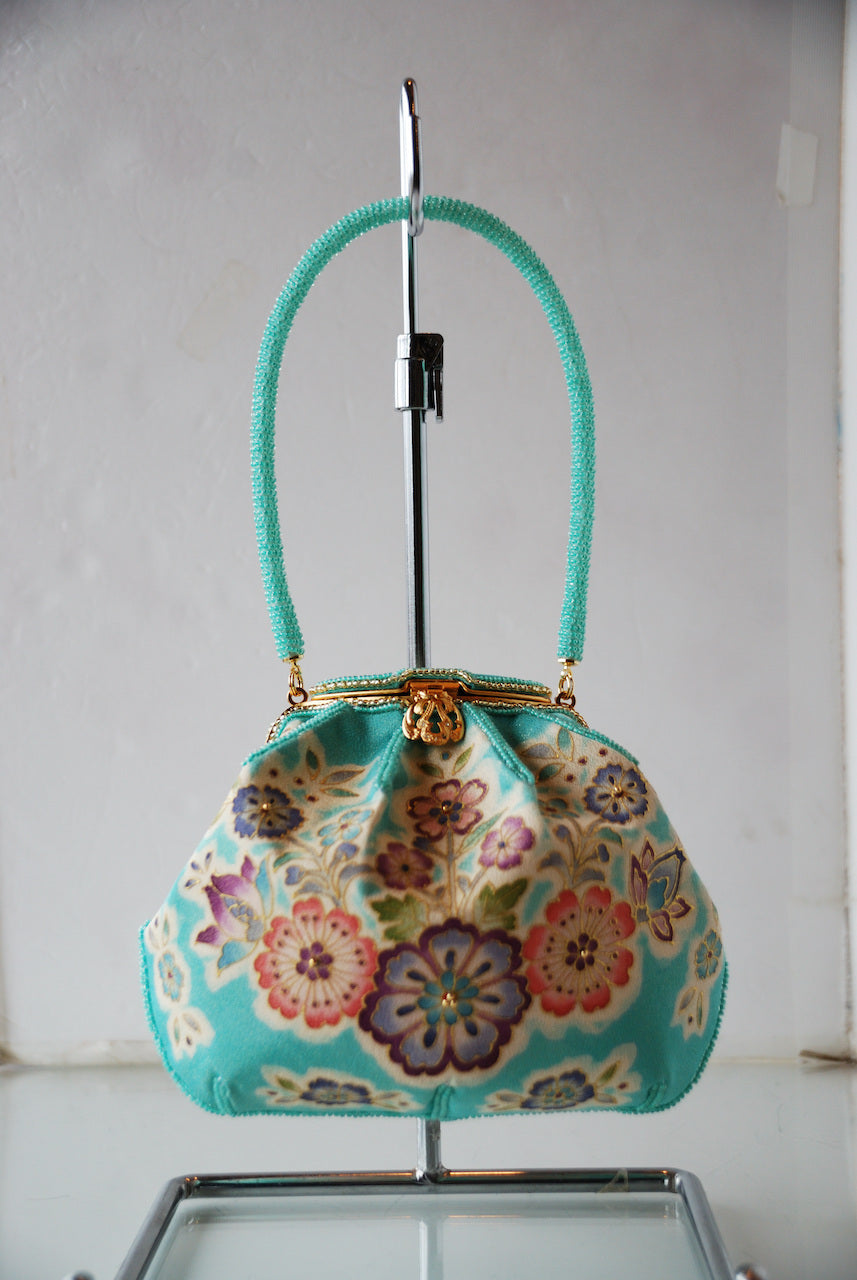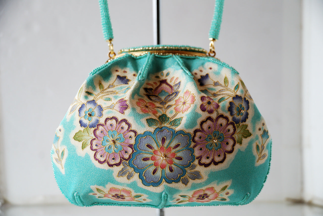 手描き友禅を施した梨地金通しの正絹に、ビーズをあしらいバッグに仕立てました。