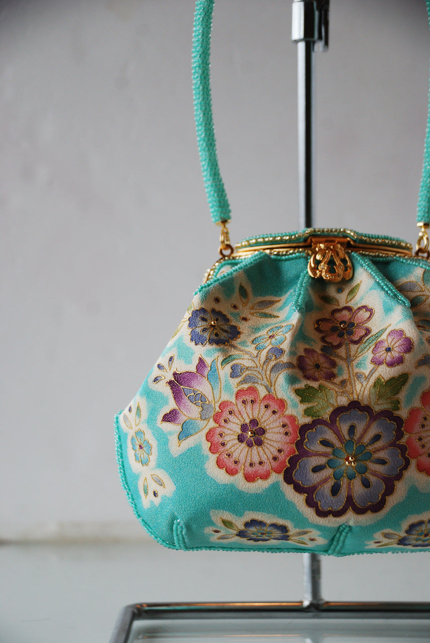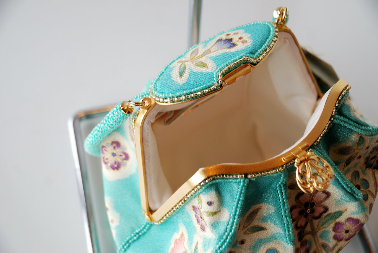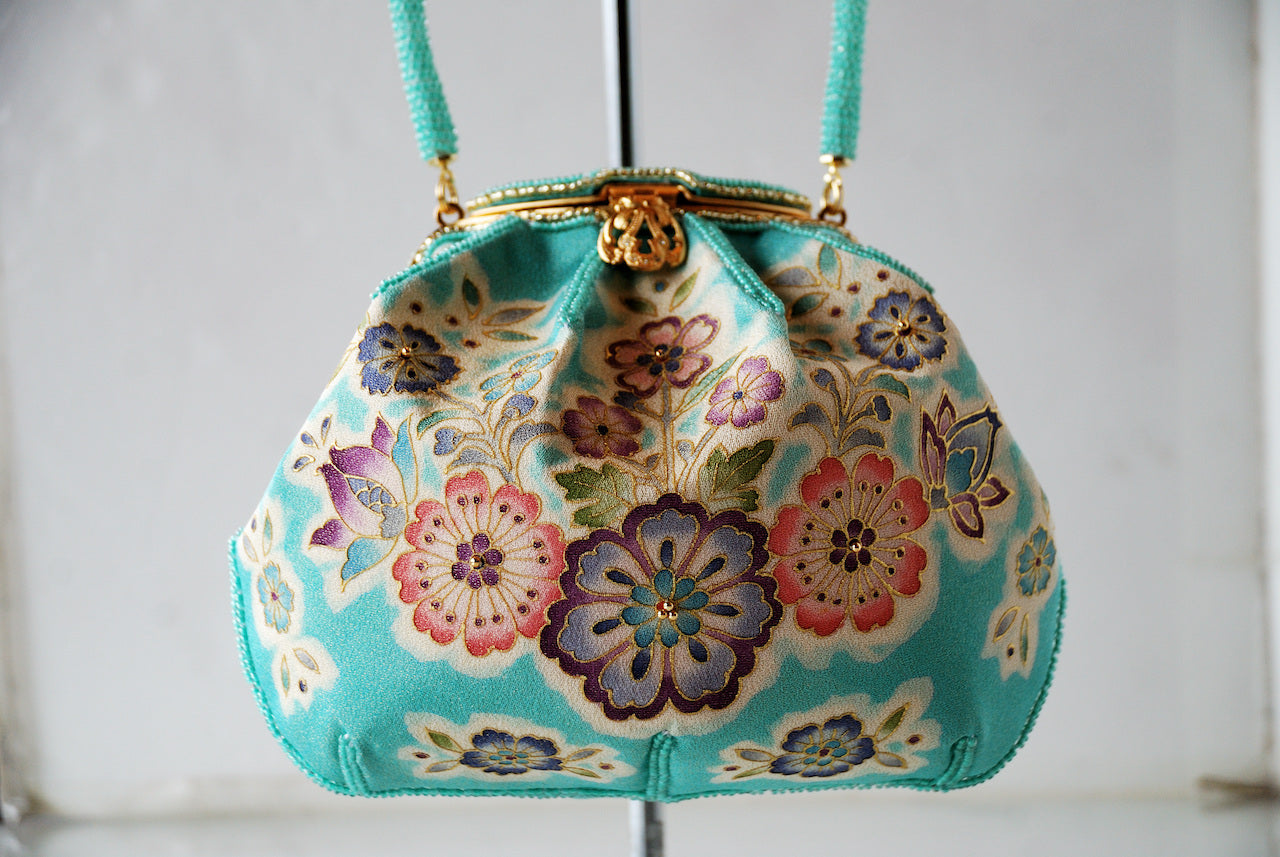 手描き友禅を施した梨地金通しの正絹に、ビーズをあしらいバッグに仕立てました。
